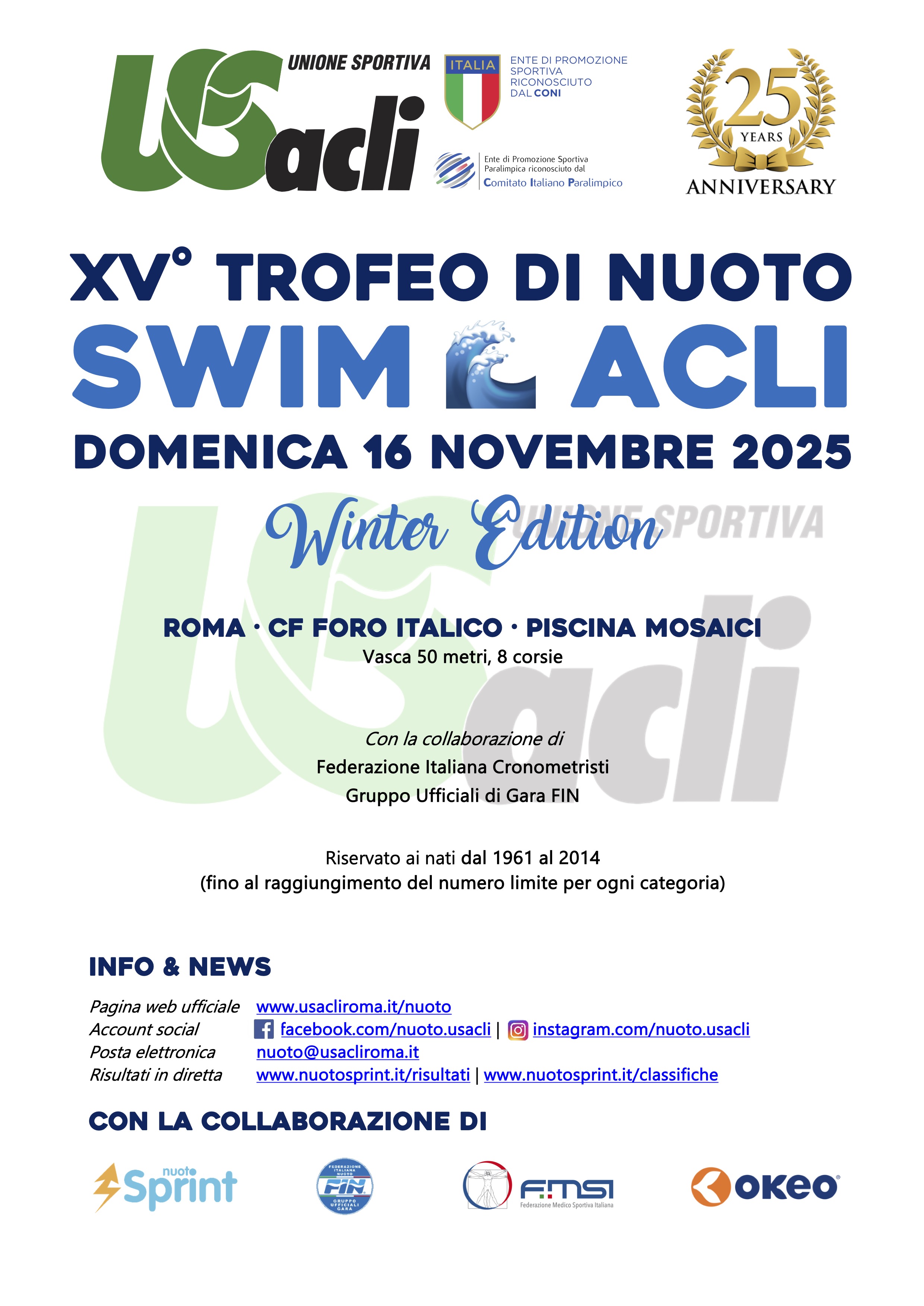 Domenica 16 novembre si da il via alla Winter Edition del XV° Trofeo di Nuoto Swim Acli, a Roma presso il CF Foro Italico Piscina Mosaici.